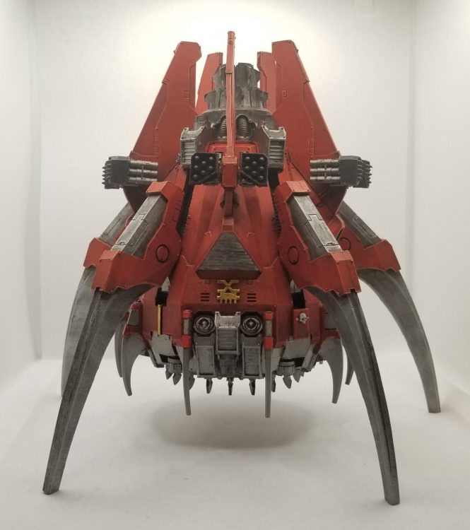 A bigger Dreadclaw with 8 hull points, a capacity of 22, and a weapon (kind of) for 235 points. It only has a 14” move, so gets you marginally less far up the board. It can carry walkers up to Leviathans and Deredeos. It can also carry even the biggest Primarchs.