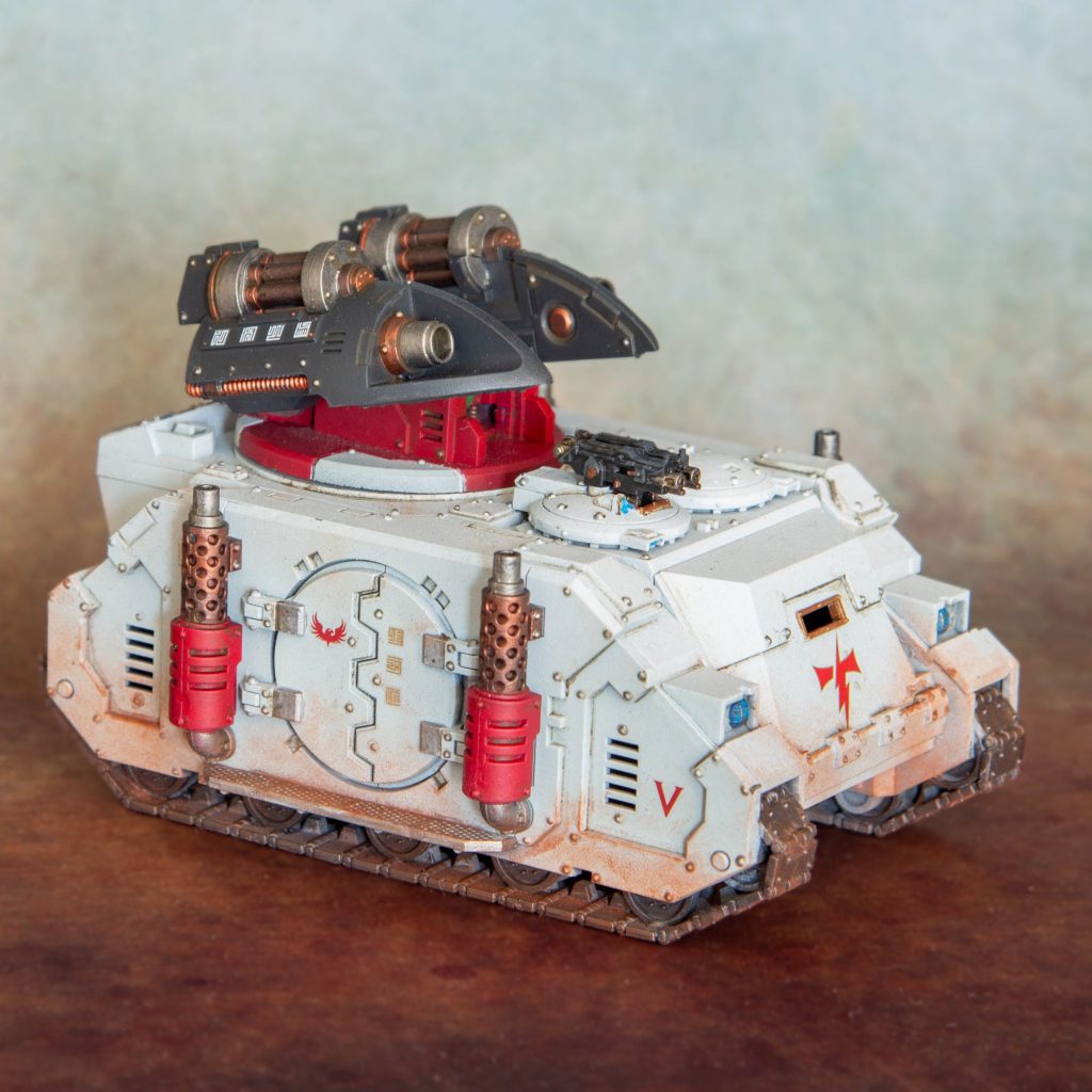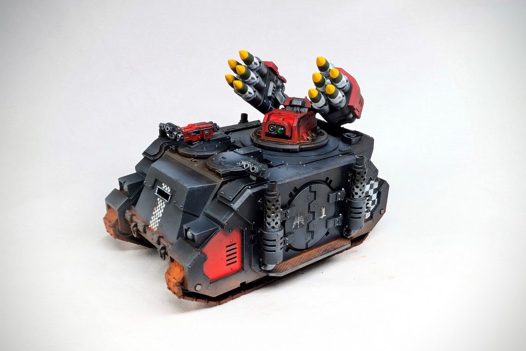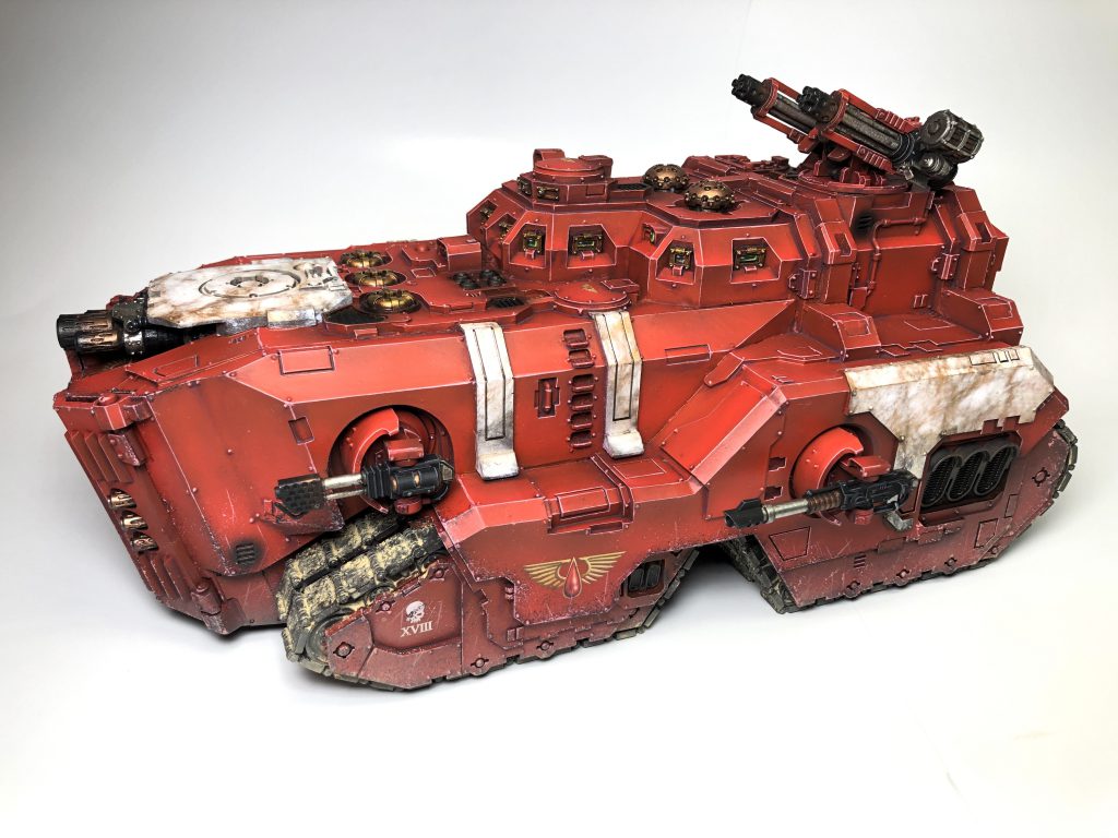 A bigger Land Raider with 10 hull points, an enormous capacity of 26 and Auto-repair 4+. It costs a lot: 400 points. All the same upgrades are available, with the same things to consider with defensive weapons and so on.