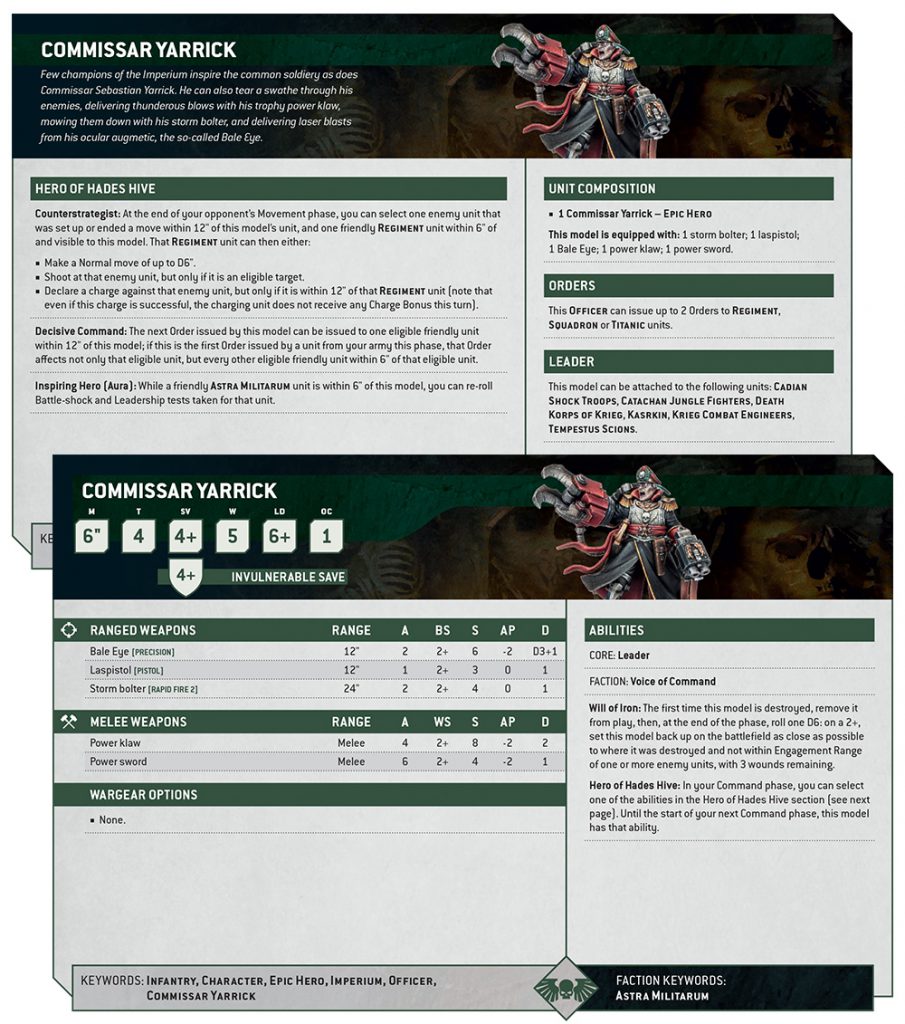 As befits the hard-as-nails defender of Armageddon, this Datasheet provides a mix of personal grit and super strong buff effects. Yarrick is unusually dangerous in a fight for a footslogging Guard officer, able to pick off a few models either in melee or at close range, and his legendary toughness is represented by the always powerful ability to stand back up at the end of the phase on a 2+ the first time he’s killed.