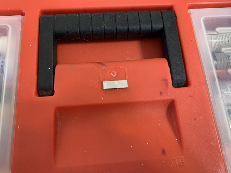 Glued to my hobbying toolbox. Always right side up.