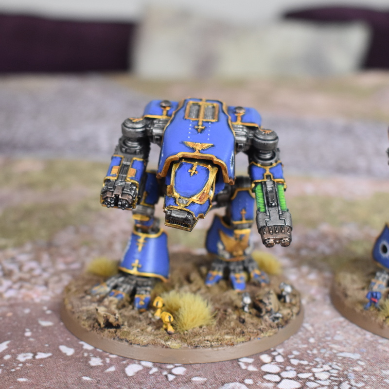 I use desert basing on my Adeptus Titanicus army, which is the Legio Astorum. They fought at the Battle of Tallarn (hence the little Ultramarines, Imperial Fists, and Iron Warriors who also feature) which was virus bombed by the Iron Warriors during the Horus Heresy, turning it into a desert world. I should state right up front here that I didn't develop this technique myself - SA goon General Olloth taught me it and I have copied it shamelessly for your consumption.