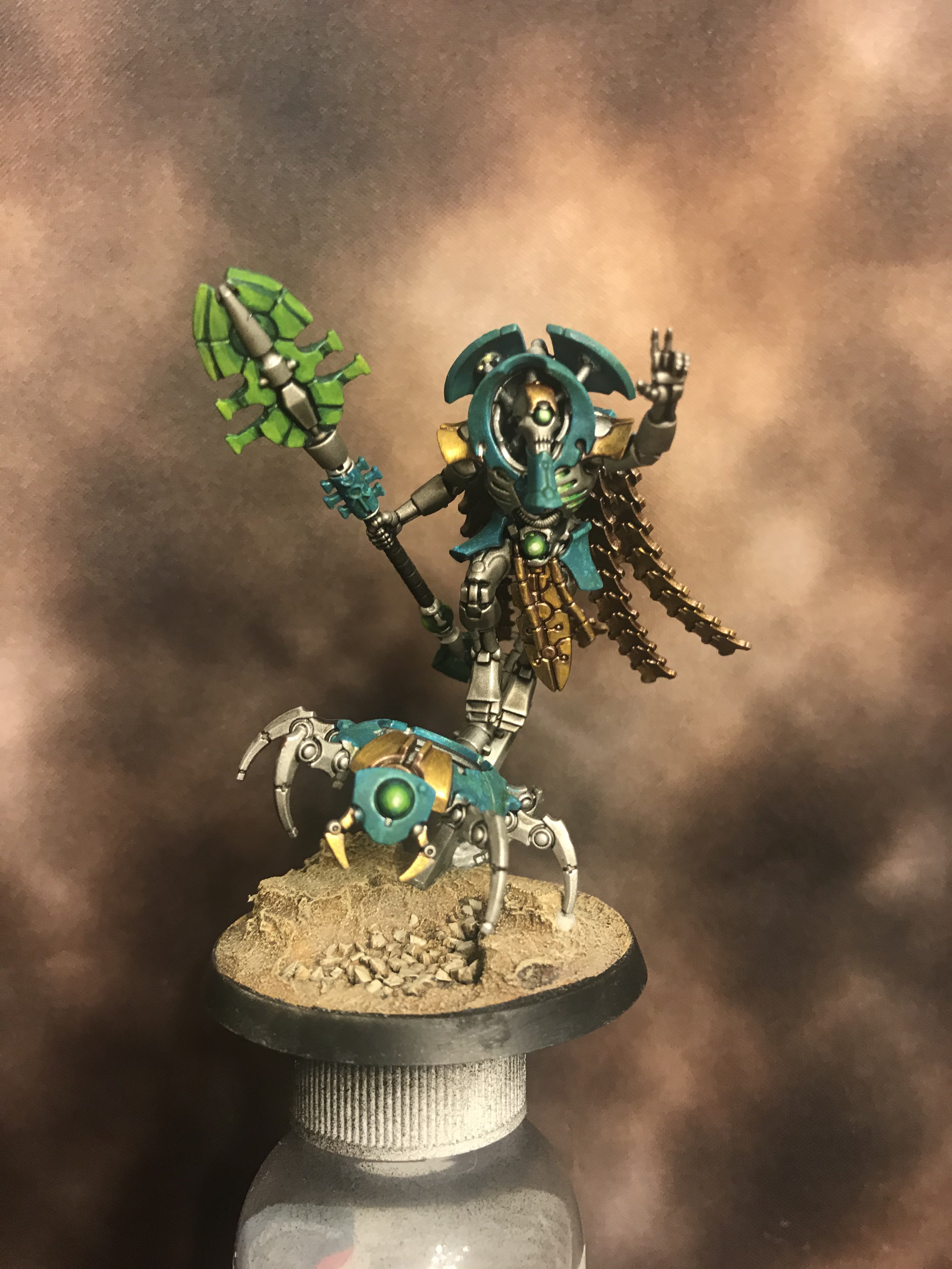 To me, Necrons are only as good as the ground they’re standing on and I really wanted my ground to stand out. I landed on a desert world, very much in the theme of the old Tomb King range from WHFB. Starting the bases is simple. Lay down some cork torn into various shapes and adhere to the bases with super glue. Then, use some Vallejo Ground Texture Acrylic base (I used Grey Sand, but any gritty texture will work.) While the paste is still wet, I sprinkled some crushed walnut shells into the lower recesses on the bases, pressing them into the paste a bit to make sure they stick.