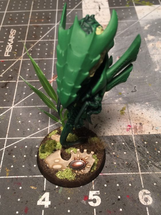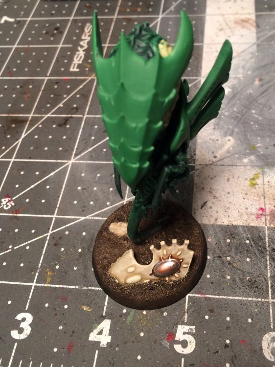 Step -2: Assemble your model and glue it to the base along with any additional desired bits of rubble, discarded equipment, scampering wildlife, or other scenic elements. My armies all have a "temple ruins" theme pulling from an eclectic assortment of Eldar, Tomb King, and Lizardmen parts.