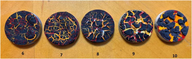 Subjects 8 and 9, and to a much lesser degree 5, showed the same weird results as my first batch with the paint separating and white streaks showing underneath. The common element in those three samples is PVA - 8 and 9 had a layer under the paint, 5 only on top of the paint. But 2 and 7 also had PVA on top of the paint. The upshot here is that I should just avoid using PVA under my base coat of paint and probably under any of the Citadel crackle texture paints, which is what Warhammer TV told you to do in the first place.
