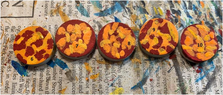 ">a video on Warhammer TV suggesting to put down ‘Ardcoat on top of the paint rather than PVA. Same principle I suppose and a good place to start. And should the PVA be above or below the paint? I broke down a number of test scenarios and set about to see what would look best. All of these bases were primed with Wraithbone first, all references to “paint” are a splotched mix of Mephiston Red, Vallejo Light Orange, and Vallejo Flat Yellow. Here’s what I inflicted on each one: