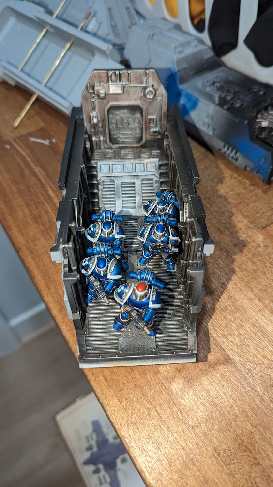 4. For the bottom front fuselage, you have to put in the two ladders, and an internal wall. I painted up the bottom front fuselage as well, and put in a small squad of Space Marines in there. I also added in two holes to pin into the bottom rear fuselage.