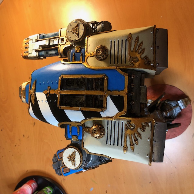 The carapace is a a mix of VGC Magic Blue, which lives up to the name, VGC Bone White, and white/black stripes that I painted white before masking off with painters tape and filling in the black. The trim is just various layers of gold, washed with Agrax, and I did a Nuln Oil pin wash along the recesses and panel lines.
