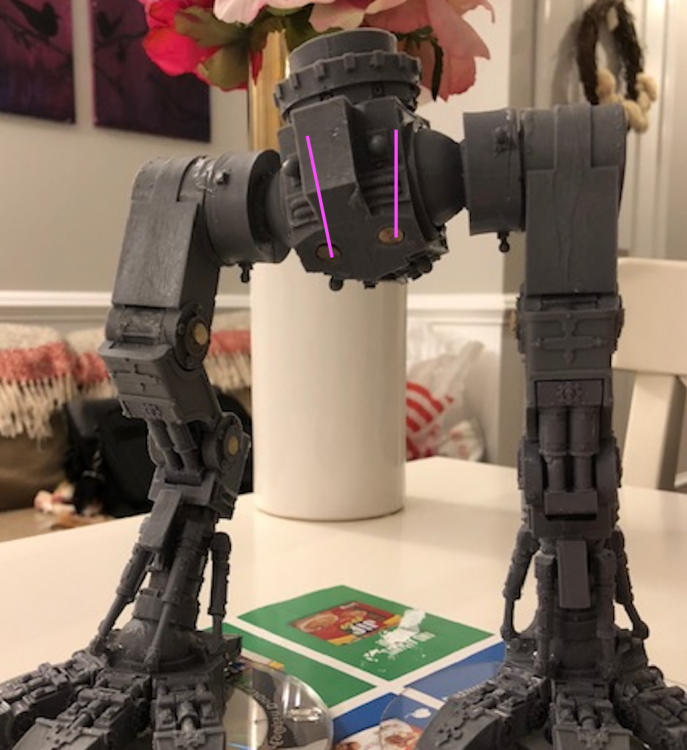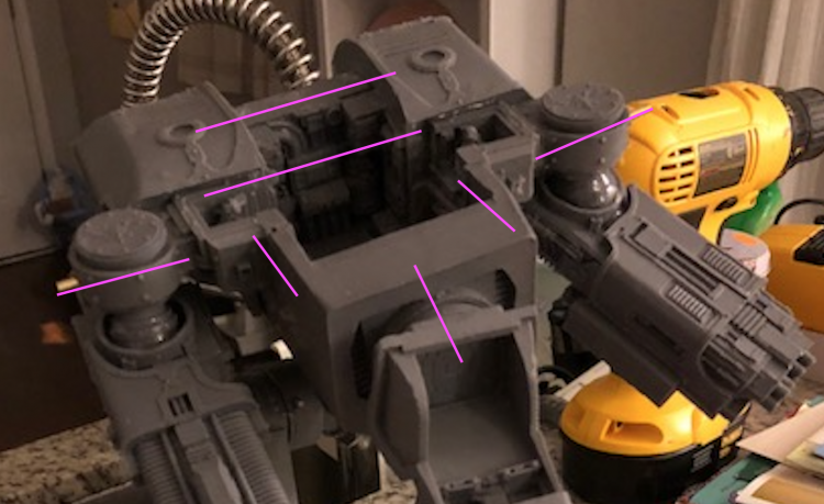 Greg: This is another spot where I went inexplicably hard in the paint. The engine blocks on the sides are secured to the central body by two pins that run clear across all three pieces. One of them is under the shoulder, in the hollow below the arm, which you can barely see if you're looking because I drilled entirely through, and the other goes across the center and into each block from the inside. Then there are two pins connecting the front of the hull to the back, and one long one through the neck, up into the base of the head.