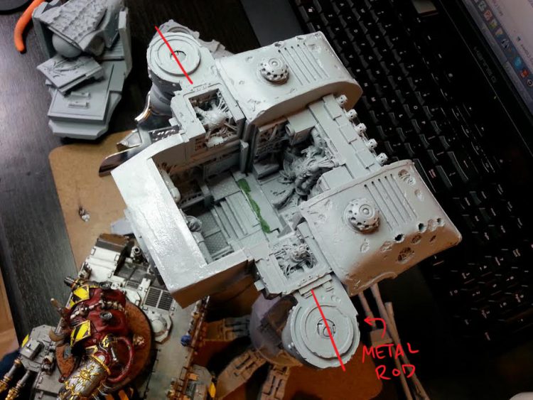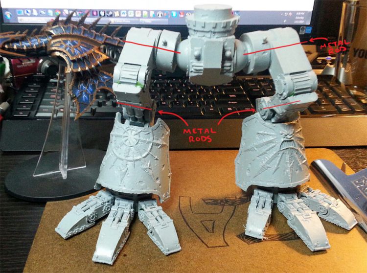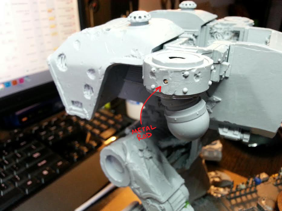 TheChirurgeon: When I first looked at how this thing went together, the arms were the thing that most terrified me, being ball-and-socket joints that hung down from the model. The guns are pretty heavy blocks of resin and I knew it was too much to ask that superglue alone be the means of holding them in place. So I put them in place and then fixed them with a pair of brass rods drilled from each side.