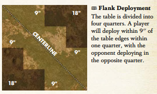 Tomes are Flank Deployment-- L-shaped deployment zones in the corners, each leg running 9" out from the board edge and 18" long (so they go to the midpoint of each table half.