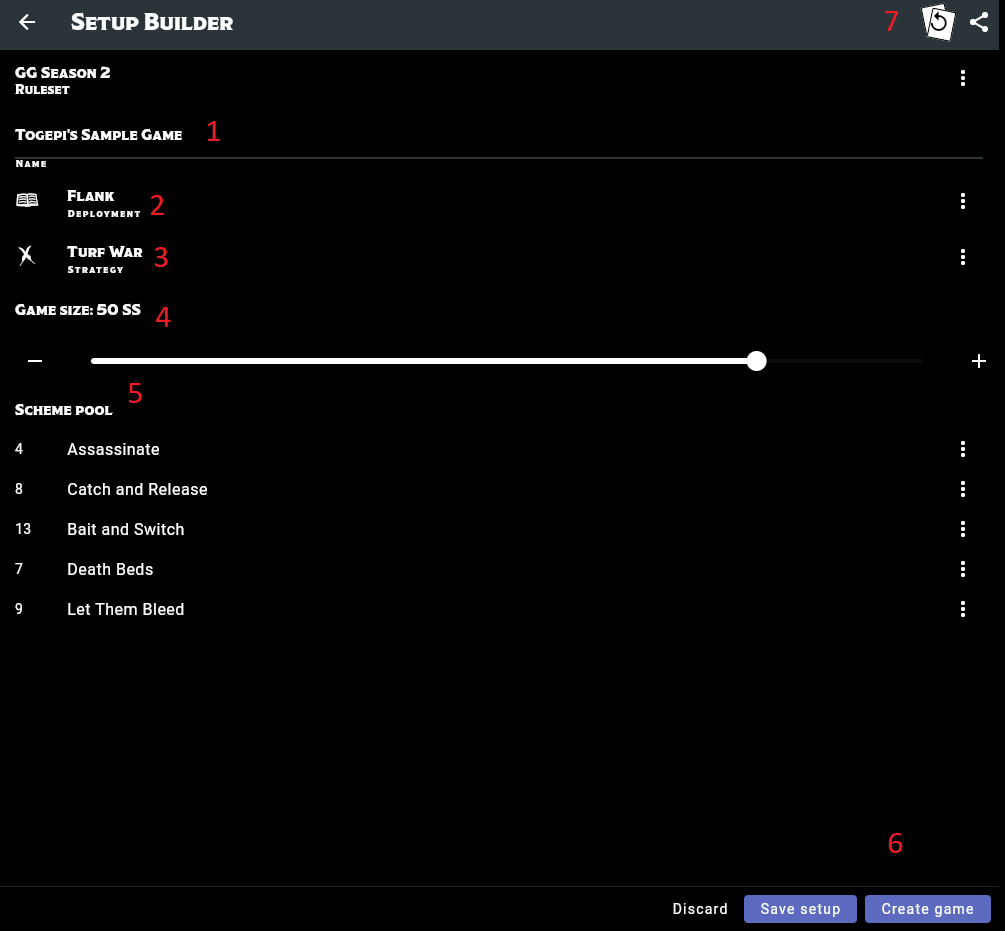 When you're happy with the game, you can hit Save Setup in the region marked 6 to save it for later, or Create Game to create it. There's no timer on a game once created, so you might as well.