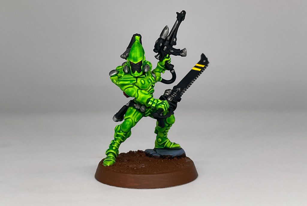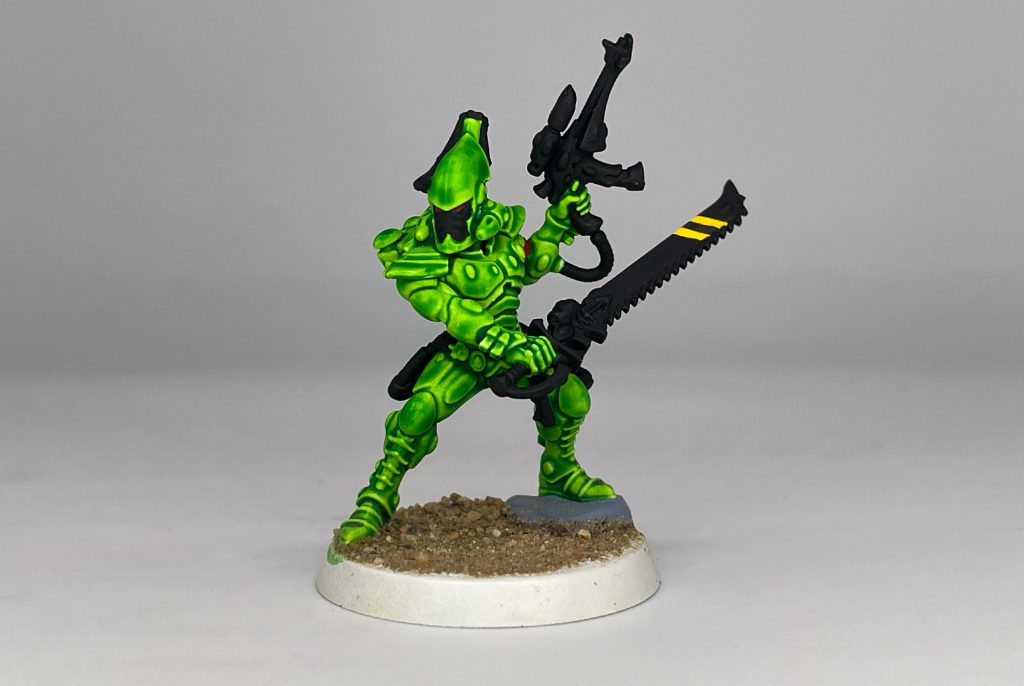 I then blocked in the weapons, holster and other details with Black. For the chainsword, I painted yellow first and then painted the stripes on it, leaving it showing. I also painted the rock Shador Grey, and added basing material. The arm band was painted with Mephiston Red.