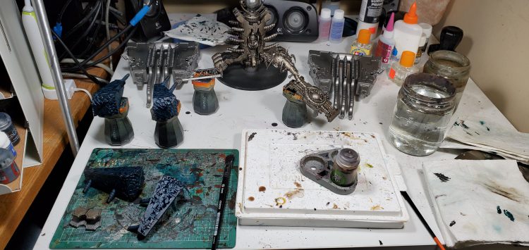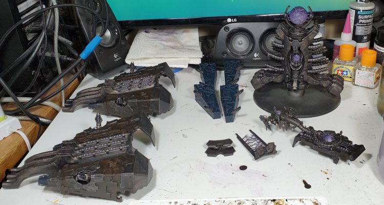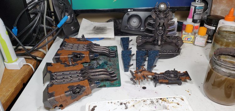 Getting the washes onto this thing is a bit of a endeavor, I would suggest trying to break up the coats into sides that won't bleed into each other and then being patient with a bunch of rotating and swapping of wet pieces. (You can see I am using Agrax and Terradon here)