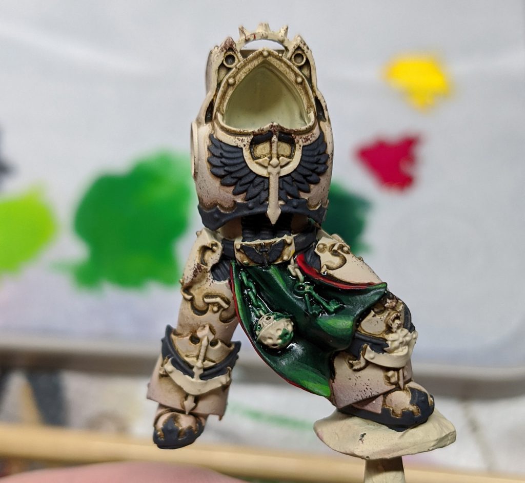 This isn't quite a perfectly traditional Deathwing - I've painted the inside of cloth bits, and some of the smaller cloth areas in red rather than pure green, and did the chest eagle in black, and instead of gold trim I went with a dark silver for contrast.