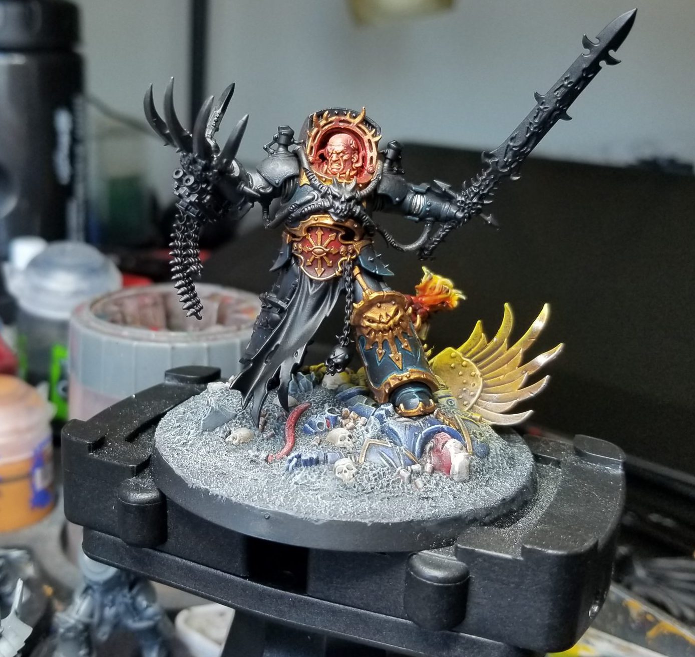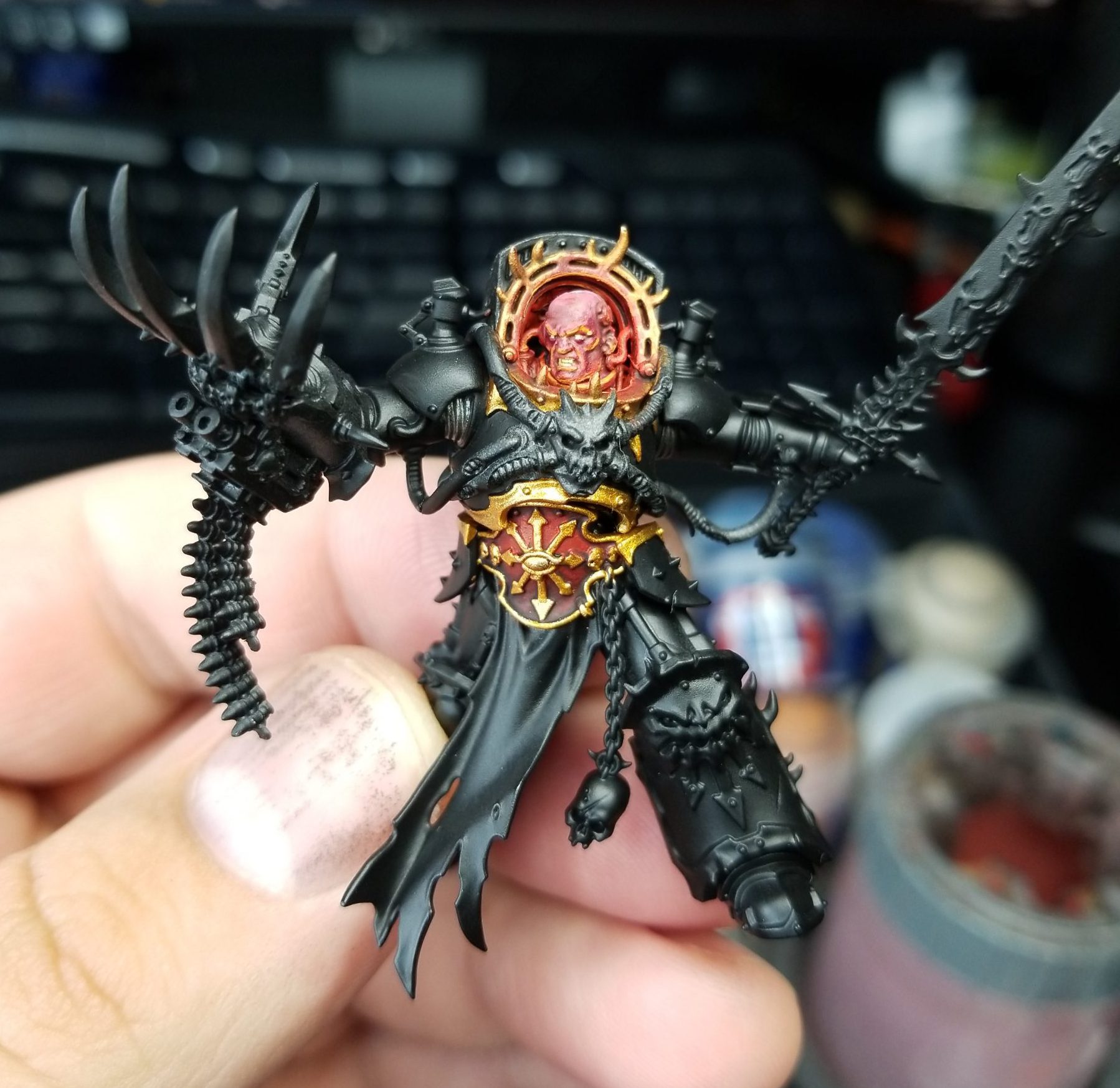 Overall I'm very happy with how Abaddon turned out. He's probably the best looking model I've ever painted, and certainly one of the ones I put the most time into. He's not super complicated colors-wise, but I do feel like I was able to accomplish quite a bit with a reasonably limited palette and he fits in well with the rest of my Black Legion. He was a great model to paint but definitely daunting in some respects. getting the armor on after painting his head was more of a challenge than I expected but I'm still glad that I did the subassemblies that way.