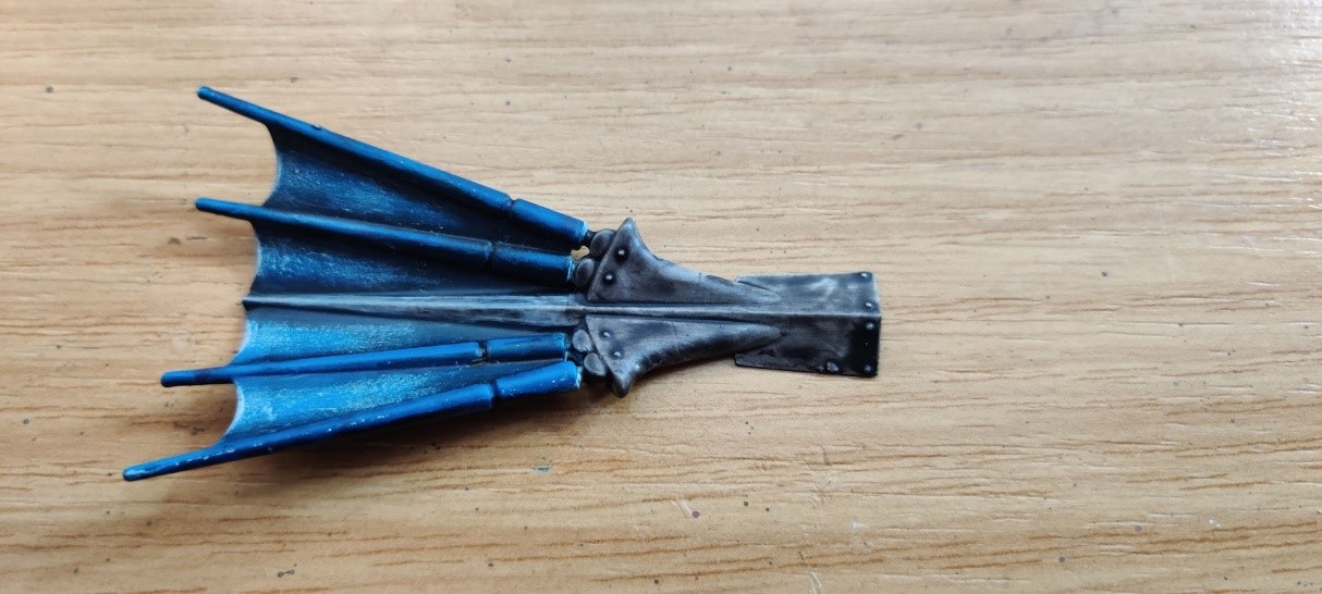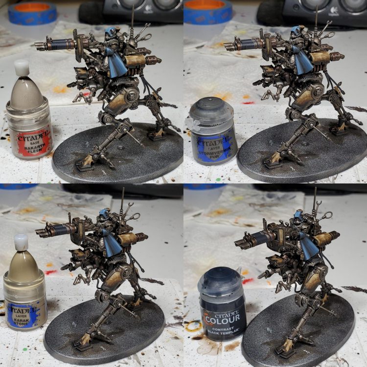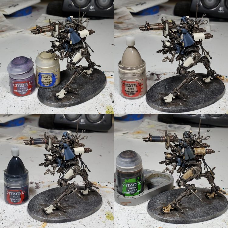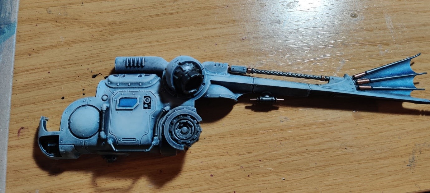 Corvus Black to blacken cables and some parts of guns to pick them out, in another area you can cheat I often find on small cables a single coat is sufficient. With that we are done all the non glow base coats and can get to highlights and washes!