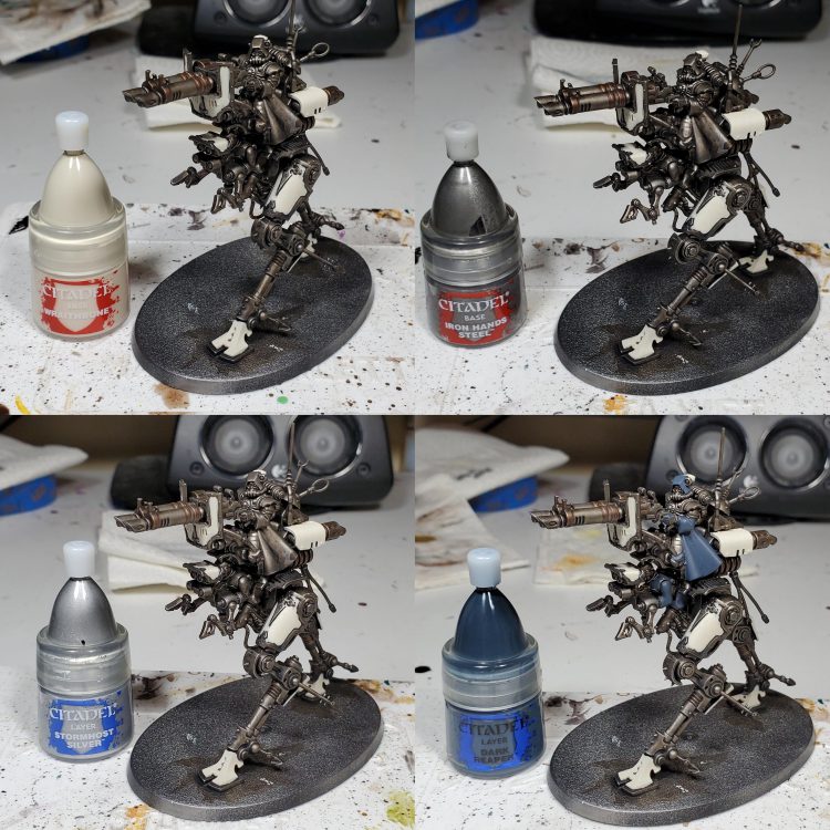 I began by airbrushing Iron Hands Steel over black primer, with Admechs heavy emphasis on mechanical contraptions its far more preferable to me to base coat a minority of the model by hand even if one of the main colours is ivory! After the base coat I threw on a sequence of washes with the intent of making a nice rich steel, while you could skip the Agrax Earthshade, I find that the browns make the metal feel far more real as it has more complexity then just being a flat metallic grey. One of the nice bonuses that starting with a neutral steel is that we can use washes to diversify the types of metal without having to do more base coats, in this case I used Fyreslayer Flesh to add some copper/bronze details. If you wanted brass snake bite can look good too!