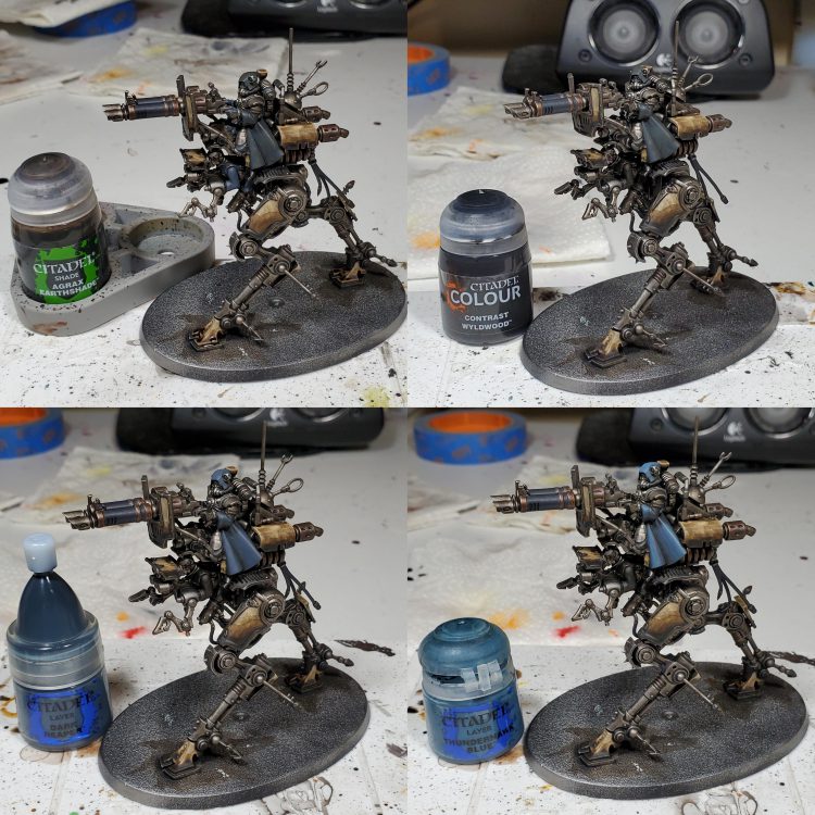 Wyldwood I would suggest doing at least one coat of thinned before going to the straight, I think I did ~3 thinned coats on this model. I also used pure wyld wood to make the leathery underarmor look more appropriate, you probably could use a different undercoat for them but it works out ok over the blue and saves a bunch of time particularly on models with both cloth and leather.
