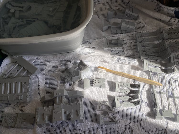 I started off clipping ALL of the parts. STOP HERE. Do what Greg did and leave the Repulsor plates on so you can grab something while painting them. They were a NIGHTMARE without something to hold on to. From there, I bathed everything in warm soapy water and went to town with a toothbrush. I picked up a super handy collapsible baby bathtub for soaking all of these absolutely massive parts. My Astraeus had a bit of brown crud kind of baked into the resin that I could not clean off no mater what I did, so I scrubbed it incessantly and gave those parts a bath in isopropyl alcohol (to no avail, visually). Overall, the marks had no effect on my painting, but if you see this on yours, definitely look out for it!
