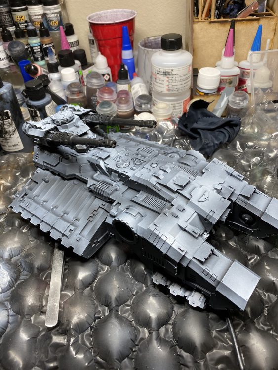 This is probably my absolute favorite vehicle I've ever painted, and I'm glad it was the impetus for most of these other assholes to buy one themselves. That said, it was pretty straightforward, if time consuming as hell. I did a lot of work in sub-assemblies - anything I could reasonably separate got taken apart. When I started painting I had the main hull as one piece, any metal piece separate, all the grav plates attached to their mounts but not attached to the hull, and the turret in 5 parts - the center, the barrels, then the two sides (with the center ammo bin attached to one side).