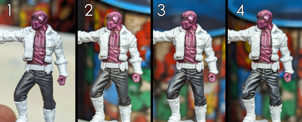 Just like with Red Skull and Crossbones we are going to use Vallejo Model Color Black Grey as the basis for the pants, we'll keep black to just the recesses and use some lighter greys to highlight them. Since they are regular fabric and not leather or vinyl we won't go up to white for highlights, stopping short to keep them from looking reflective.