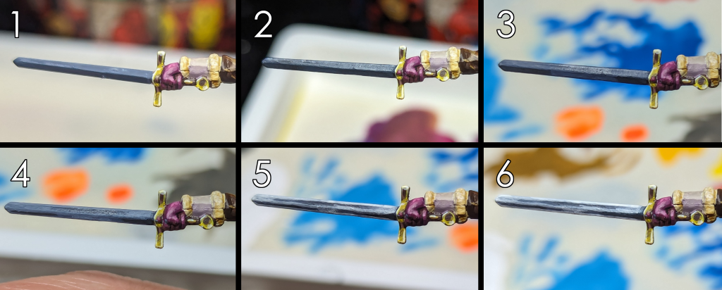 Wash the blade with Nuln Oil. This will darken both the base colors and allow us to use Luftwaffe Uniform WWII again as a highlight color.
