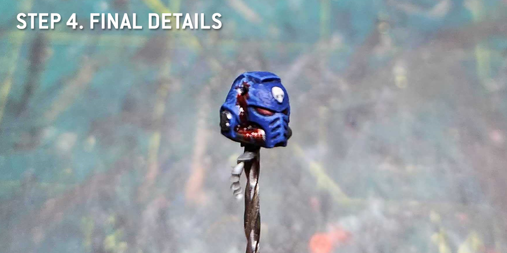 If you want to add even more brutal effects, note that significant burns will cause the skin to blister. Build up the redness in a significant fashion but leave a rough area in the center of the red area clear of the glaze, then use Nurgle’s Rot to paint a blister. When dry, apply a second layer to give more depth, and apply a little thinned Blood for the Blood God around it.