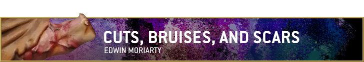 A slash of a sword or the edge of a knife, or even the trail of a bullet that just clips you, can leave minor injuries as well as those more severe. Before the healing process really begins these gashes and scrapes are red and raw.