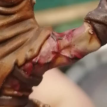 Deep cuts can create a very distinctive form of scarring after a relatively short amount of time called a hypertrophic scar. These are distinctly ridged and pink and a great add to a mini that has scars modelled onto the skin (as normal scars do not raise as much as is usually portrayed).