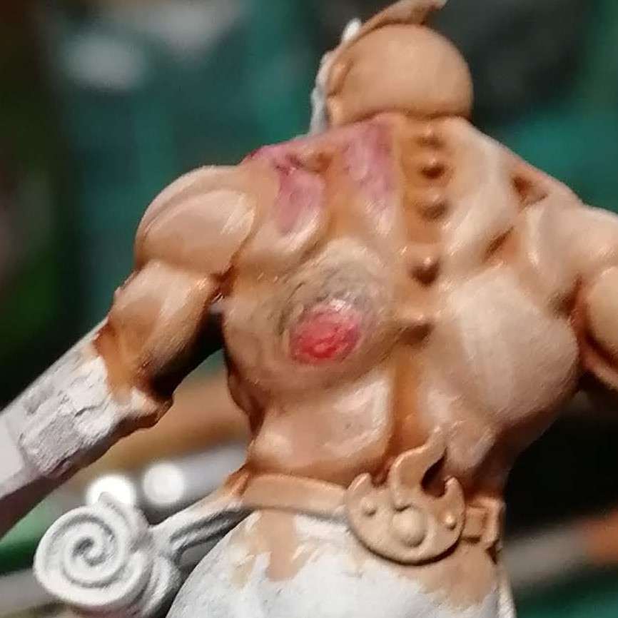 - Now using your median flesh tone (Kislev Flesh for me here) and a medium (I used Vallejo Matt but lahmian would work if you’re careful) glaze over everything that’s not the immediate cut and inflammation, just to soften the colours and blend it back into the skin tone.