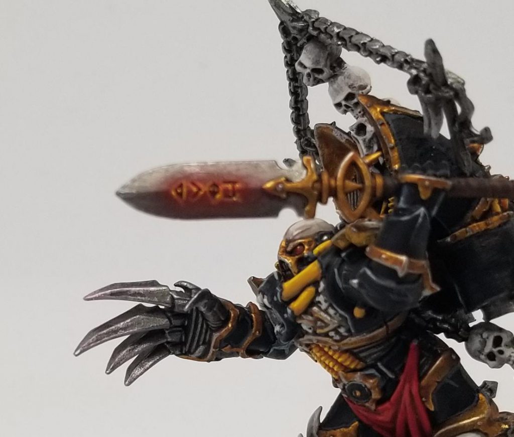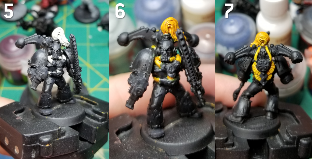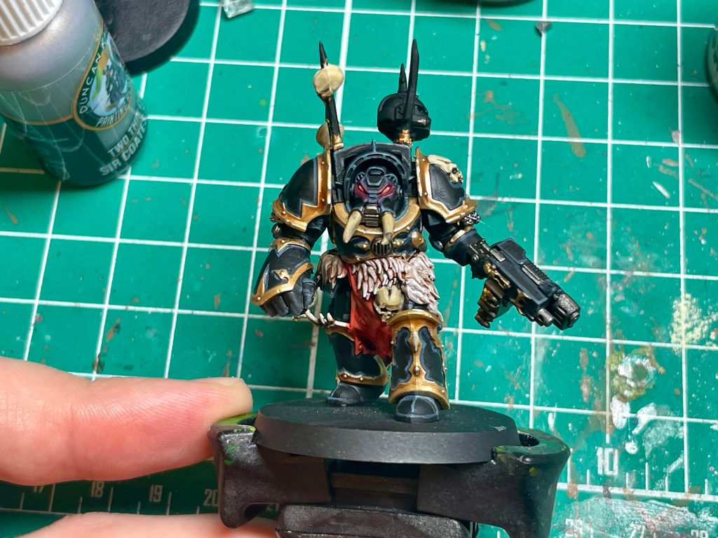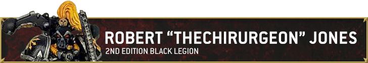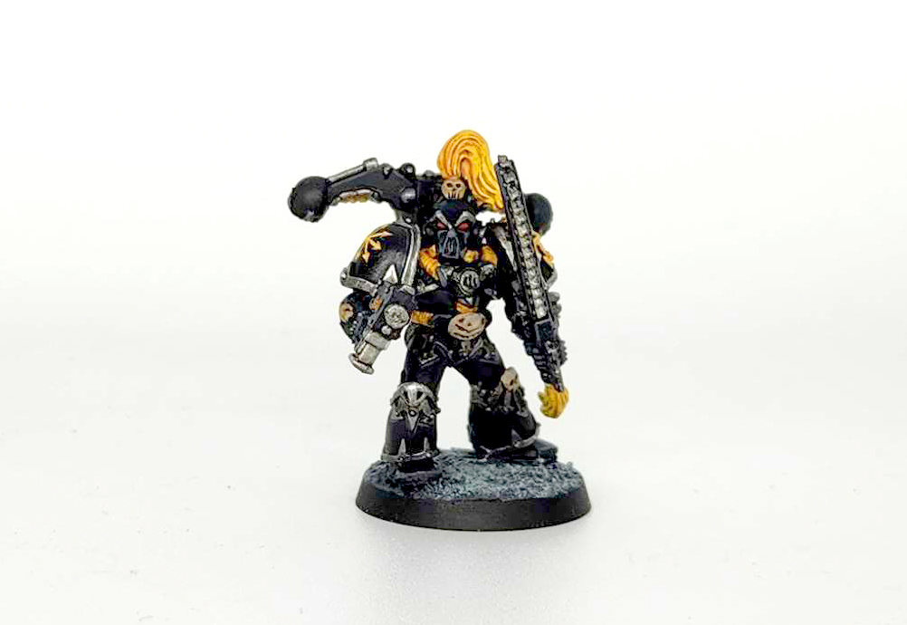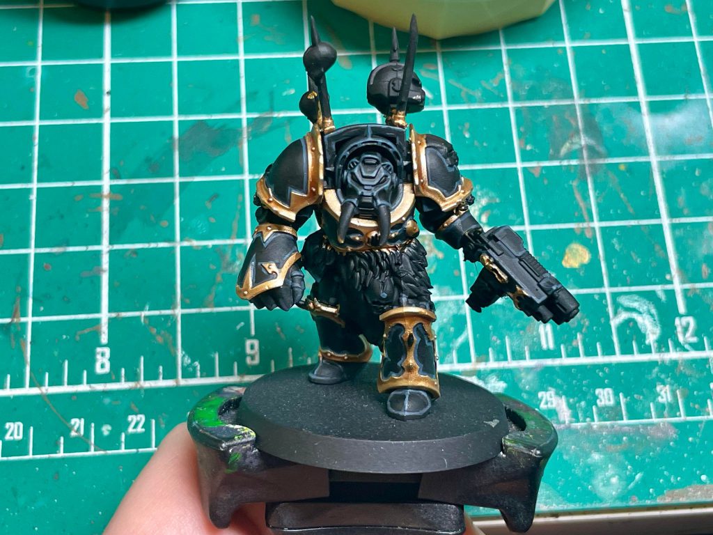 The Black Legion paint scheme can be deceptively difficult. It combines two of the biggest headaches in painting miniatures: highlighting black and lots of trim. After a few years practice I’ve managed to get my paint scheme locked in for my Black Legion. I can’t avoid painting trim or highlighting black, but I can try and make it as easy as possible.
