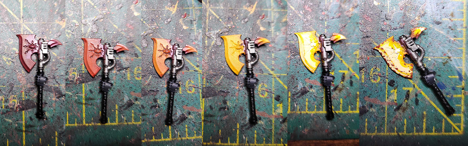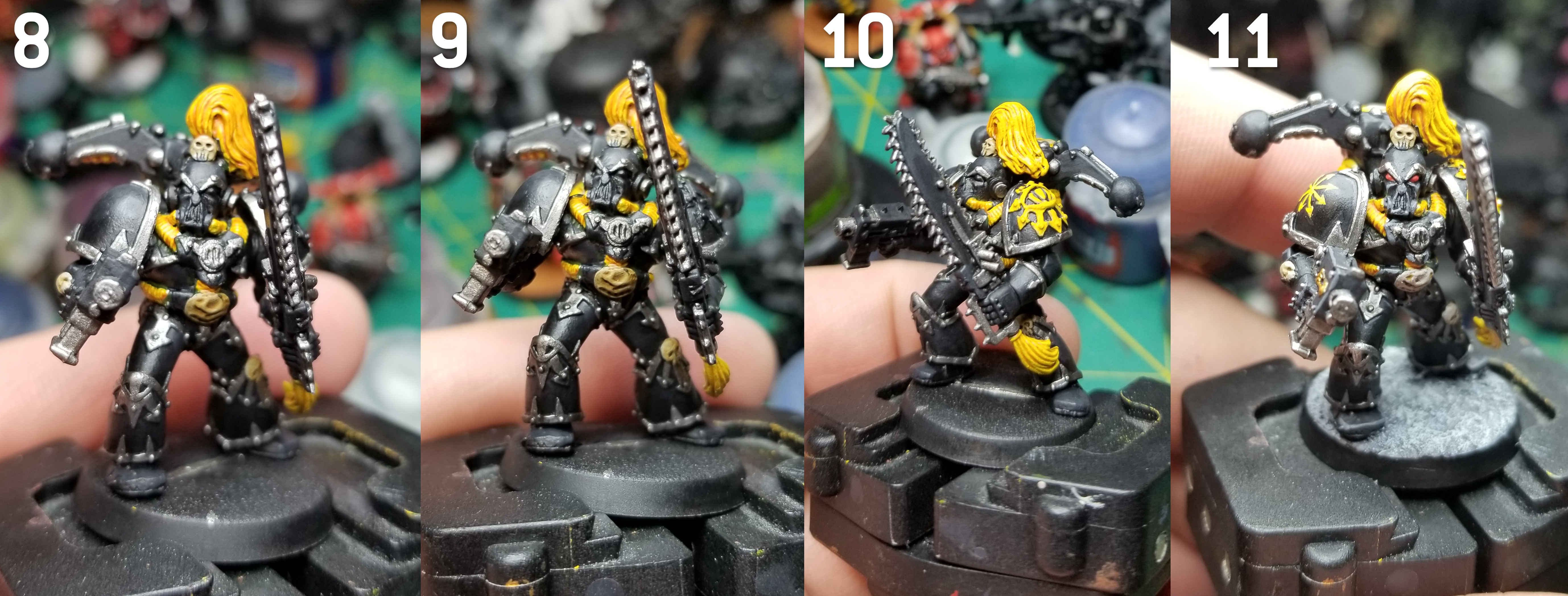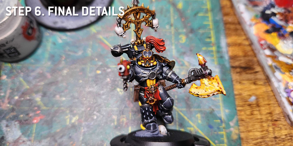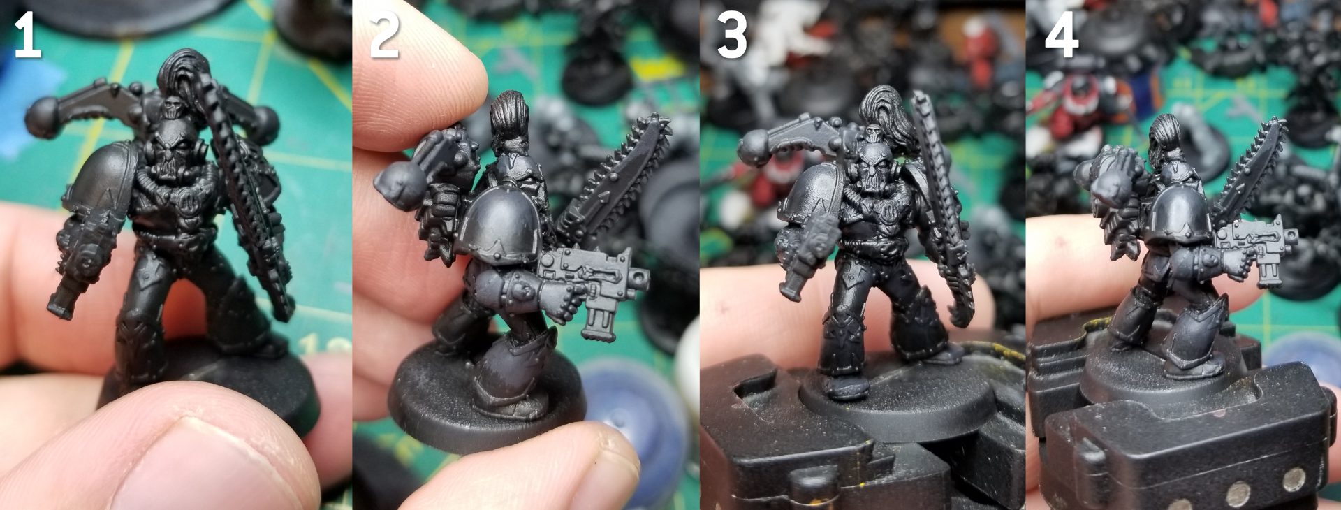 The Black Legion paint scheme can be deceptively difficult. It combines two of the biggest headaches in painting miniatures: highlighting black and lots of trim. After a few years practice I’ve managed to get my paint scheme locked in for my Black Legion. I can’t avoid painting trim or highlighting black, but I can try and make it as easy as possible.