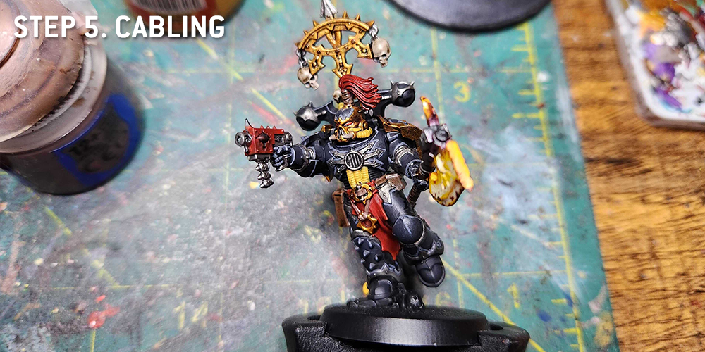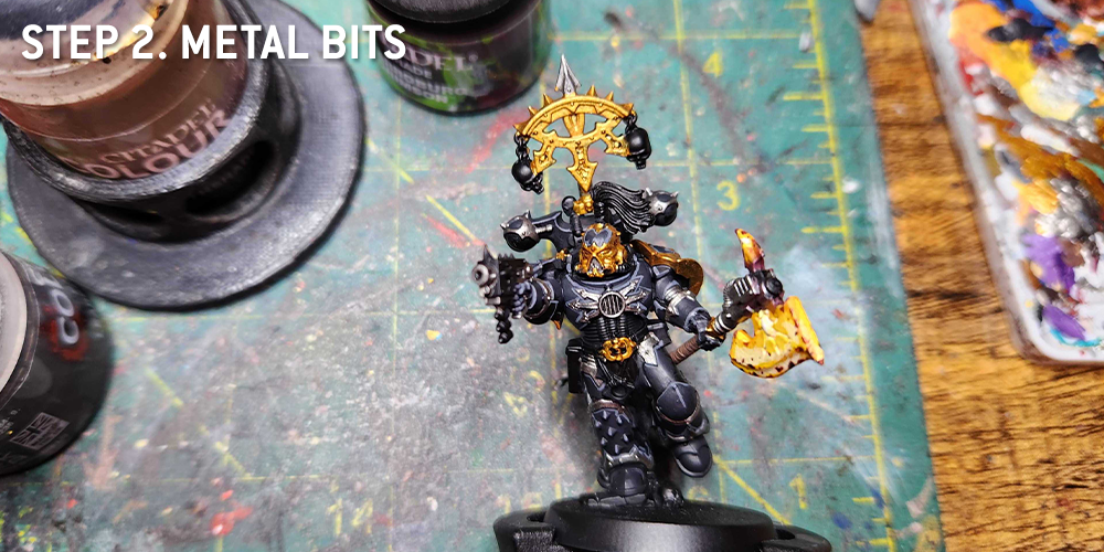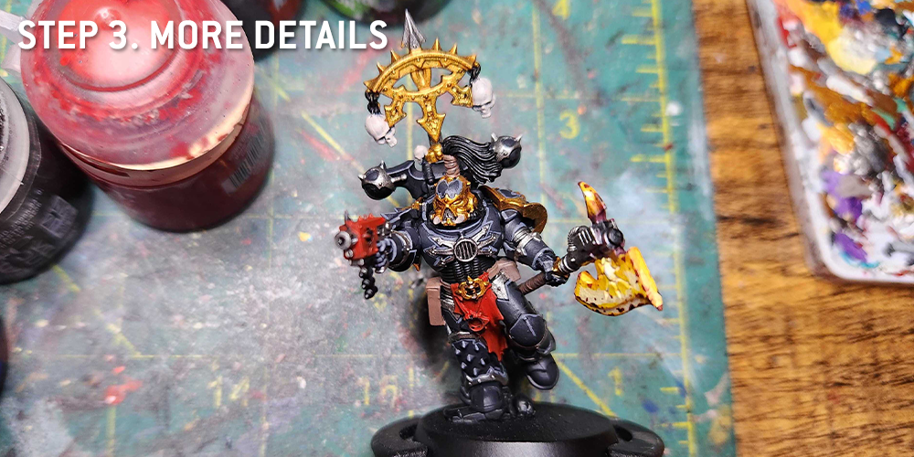 For the trim, I prefer a brighter gold for my Black Legion. I do this by basing with