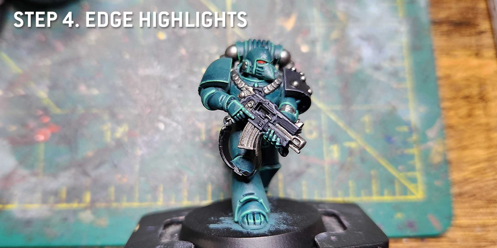Thunderhawk Blue. Try to keep these edge highlights thin so that the model still reads as black after highlighting, but don’t panic if you make a mistake. You can always clean up a messy edge highlight with more