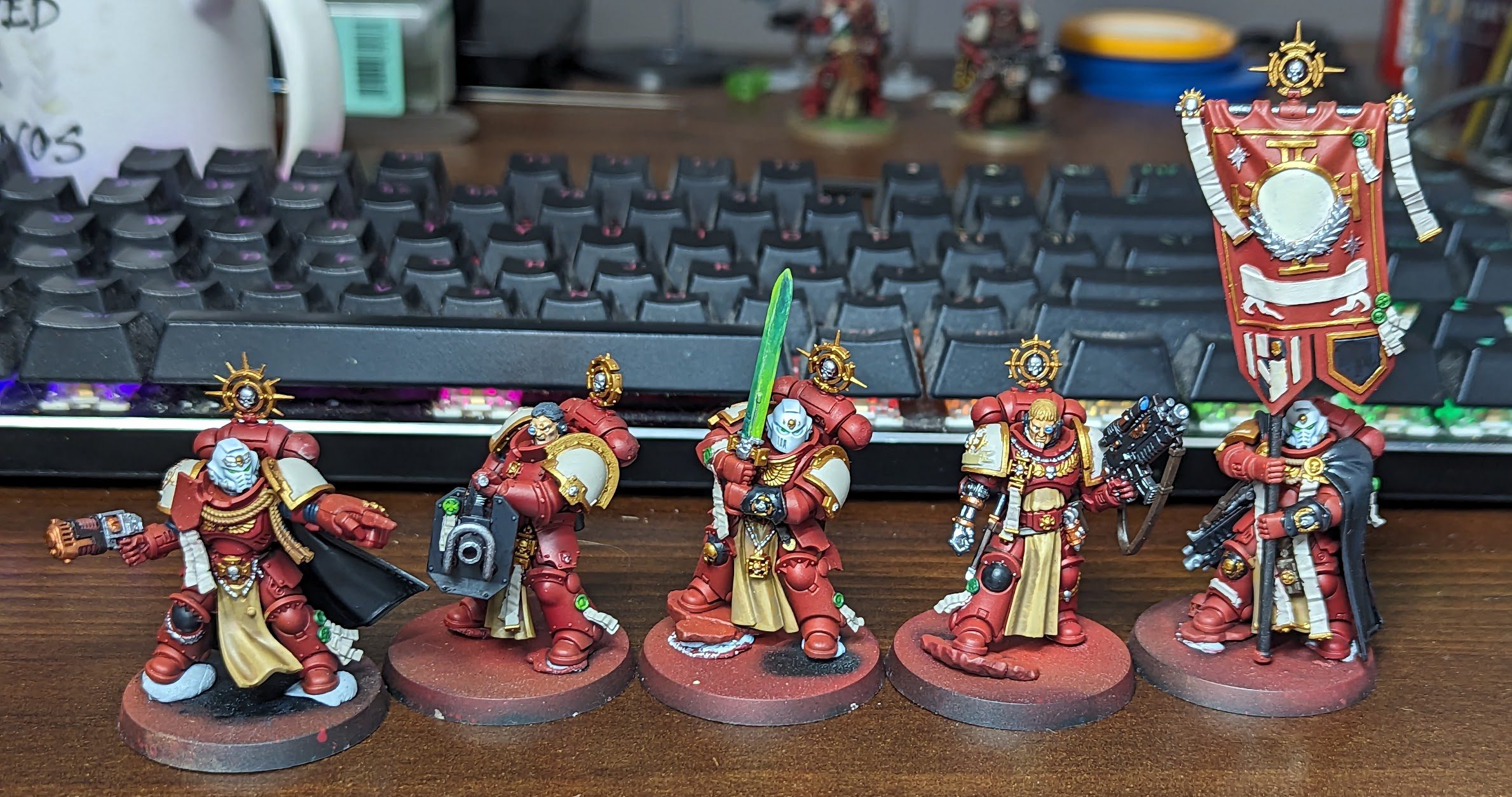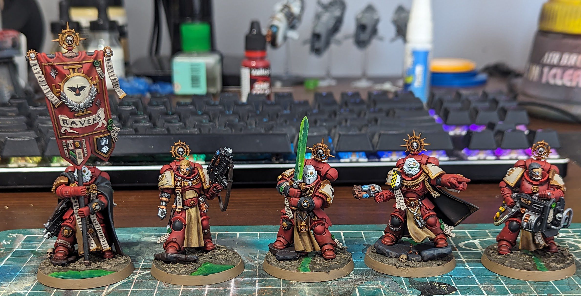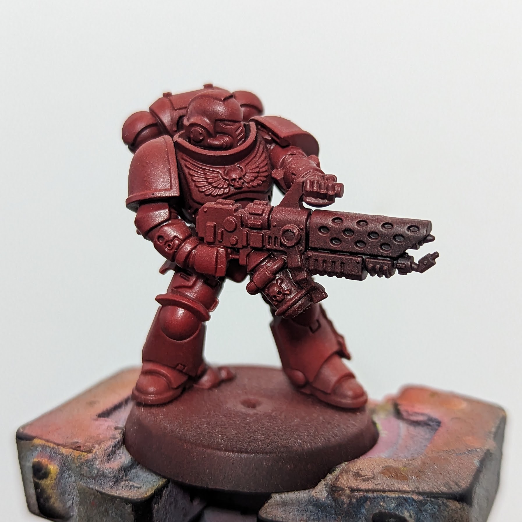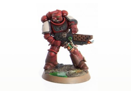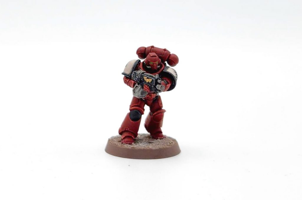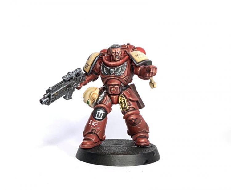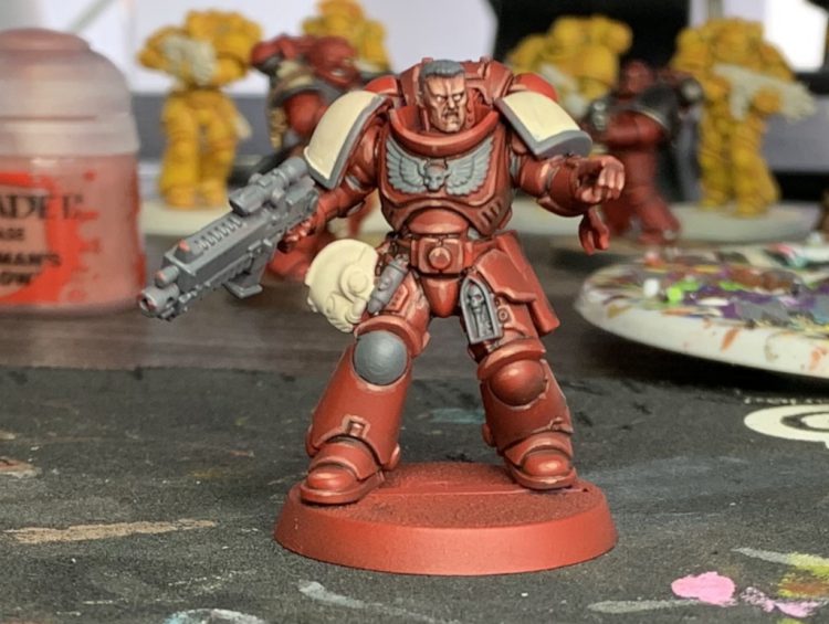 Flesh Tearers Contrast Paint. If I had known he was going to be a Blood Raven from the start, I'd have instead primed him Mephiston Red and washed the whole thing with Carroburg Crimson, and saved a little bit of time and effort. I'm happy with how this turned out anyways, but a note for future painters.