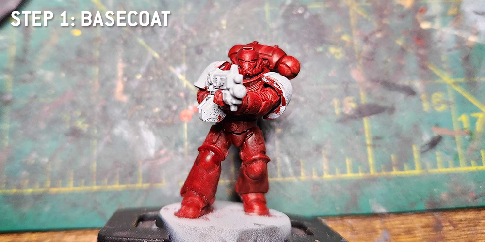 Mephiston Red, leaving some spots - primarily recesses - darkened with Flesh Tearers. In the alternate method where I prime Mephiston and wash Carroburg this is largely the same.