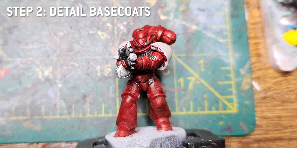 Next up I started adding in other basecoats, doing the metal parts of the bolter and underarmor with