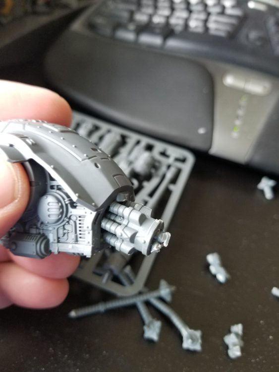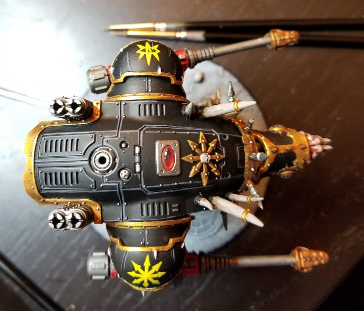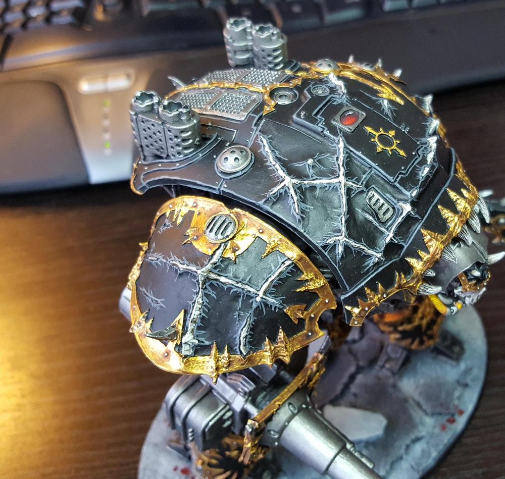 On the back of the armor I replaced the rear hatch with one from a Defiler that's chained up, and the backs of the guns have been replaced with Chaos Warrior shields to make them look appropriately chaosy as well.