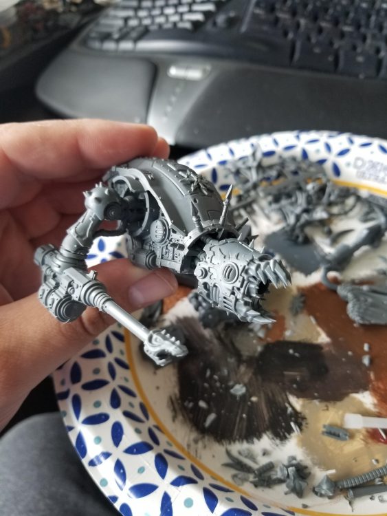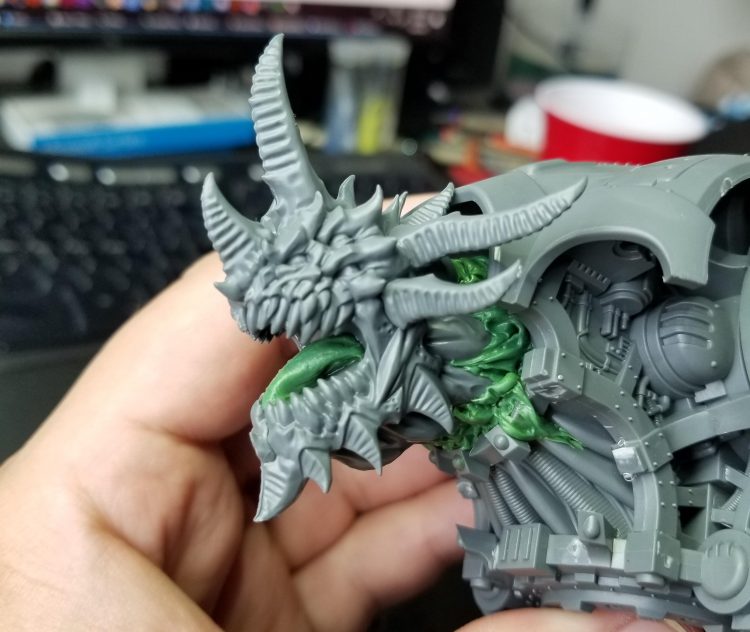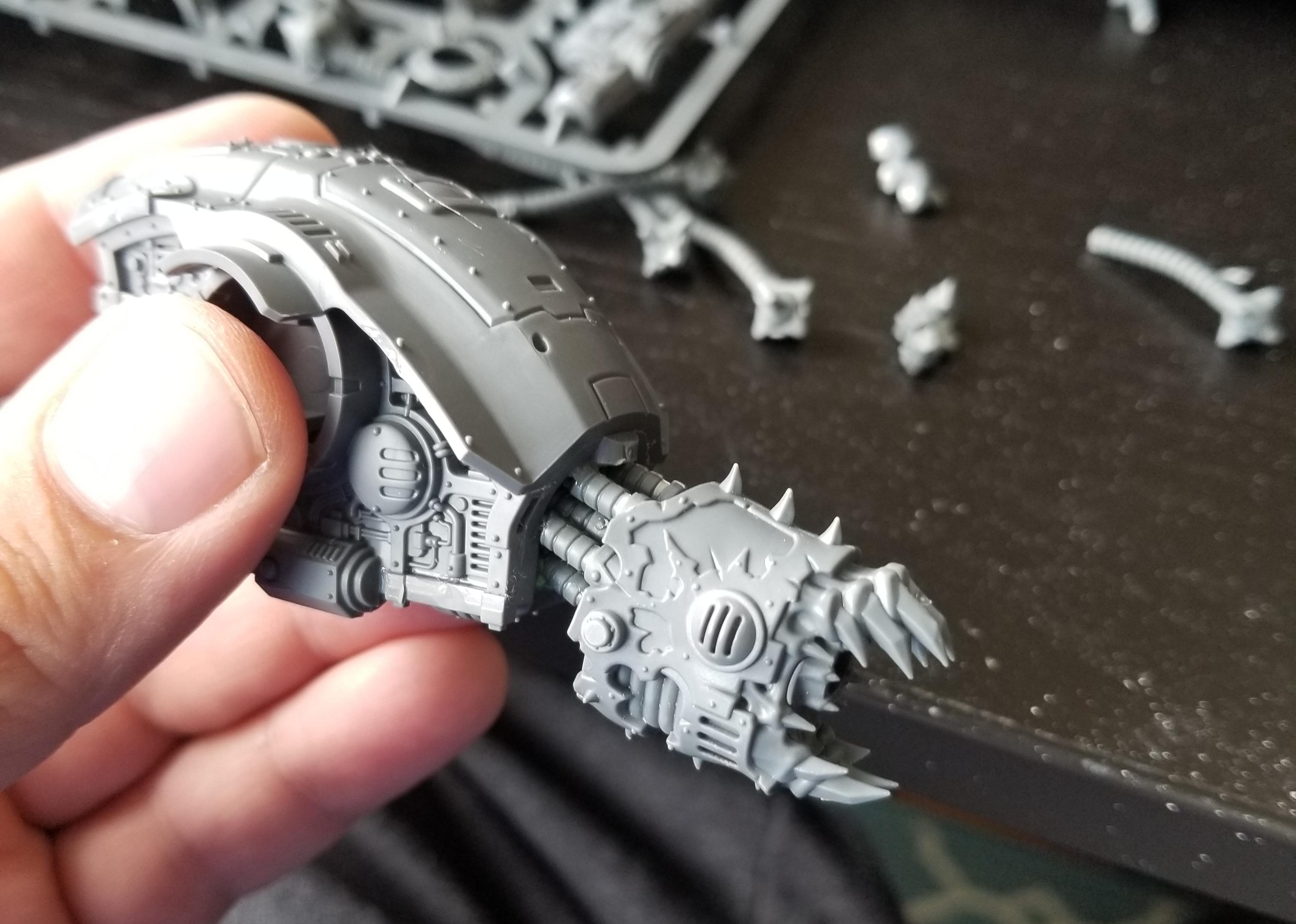 I knew early on that I wanted to put a forgefiend head on a Helverin, but actually doing that would require a lot more work and construction than just adding on a defiler mask. Mostly, it would mean building out a neck. I have a lot of extra defiler bits floating around and the Defiler Scourge, while looking terrible on the model, is a perfect fit for this. I cut its coils short and glued them back into its interior, creating what looks like a series of coils and cables that make a wonderful neck to place the Forgefiend head on.