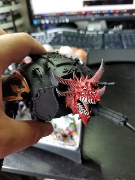 The maw is done with Bugman's Glow and the teeth are Rakarth Flesh. I'll shade the whole thing with Agrax Earthshade and then re-highlight with Bugman's and Rakarth, then do edge highlights with Reaper Polished Bone on the teeth and a mix of Polished Bone and Bugmans for the raised parts of the gums. I'll also hit the Gold parts with Retributor Armour and then wash it with Agrax.