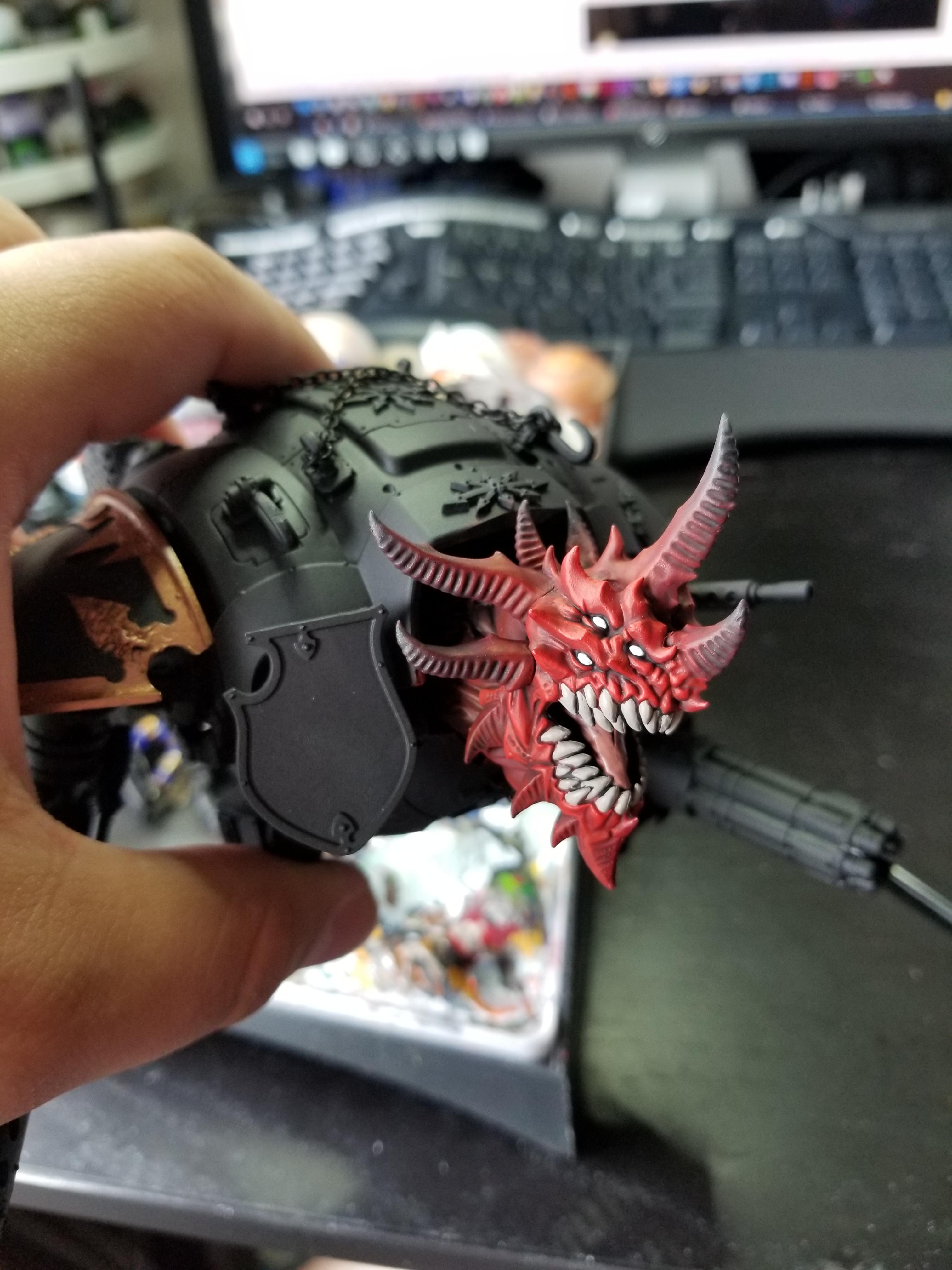 Time for the Daemon. Red works well here and I like the color as a spot color in my army since I paint all my guns red to honor the fact that I'm an old shithead who can't let go of 2nd edition 'Eavy Metal aesthetics. I start by drybrushing several layers of Khorne Red and Mephiston Red onto the head, working up to lighter shades in raised areas. Then I wash it with Carroburg Crimson around the front of the face and add more layers of Mephiston Red.