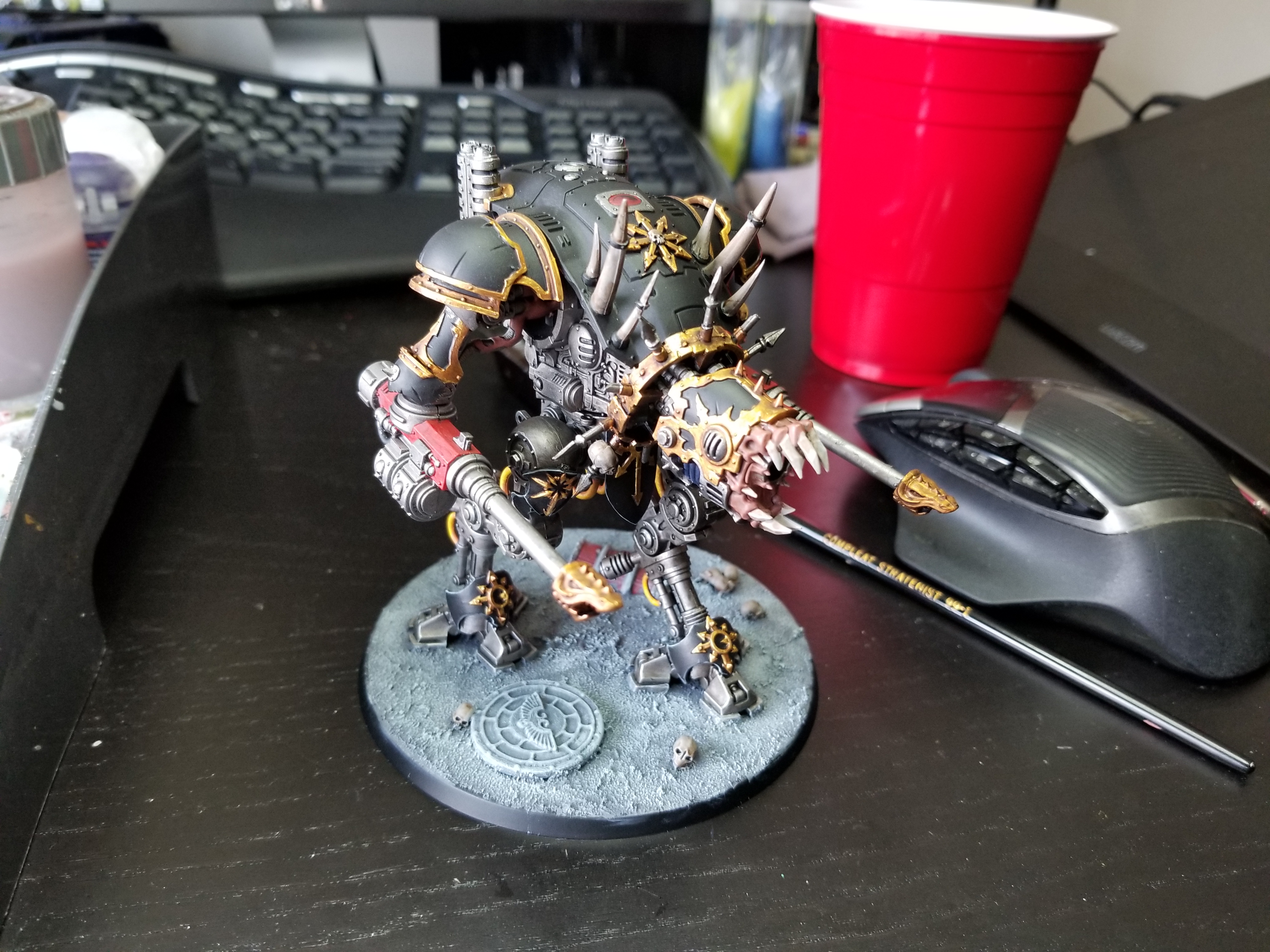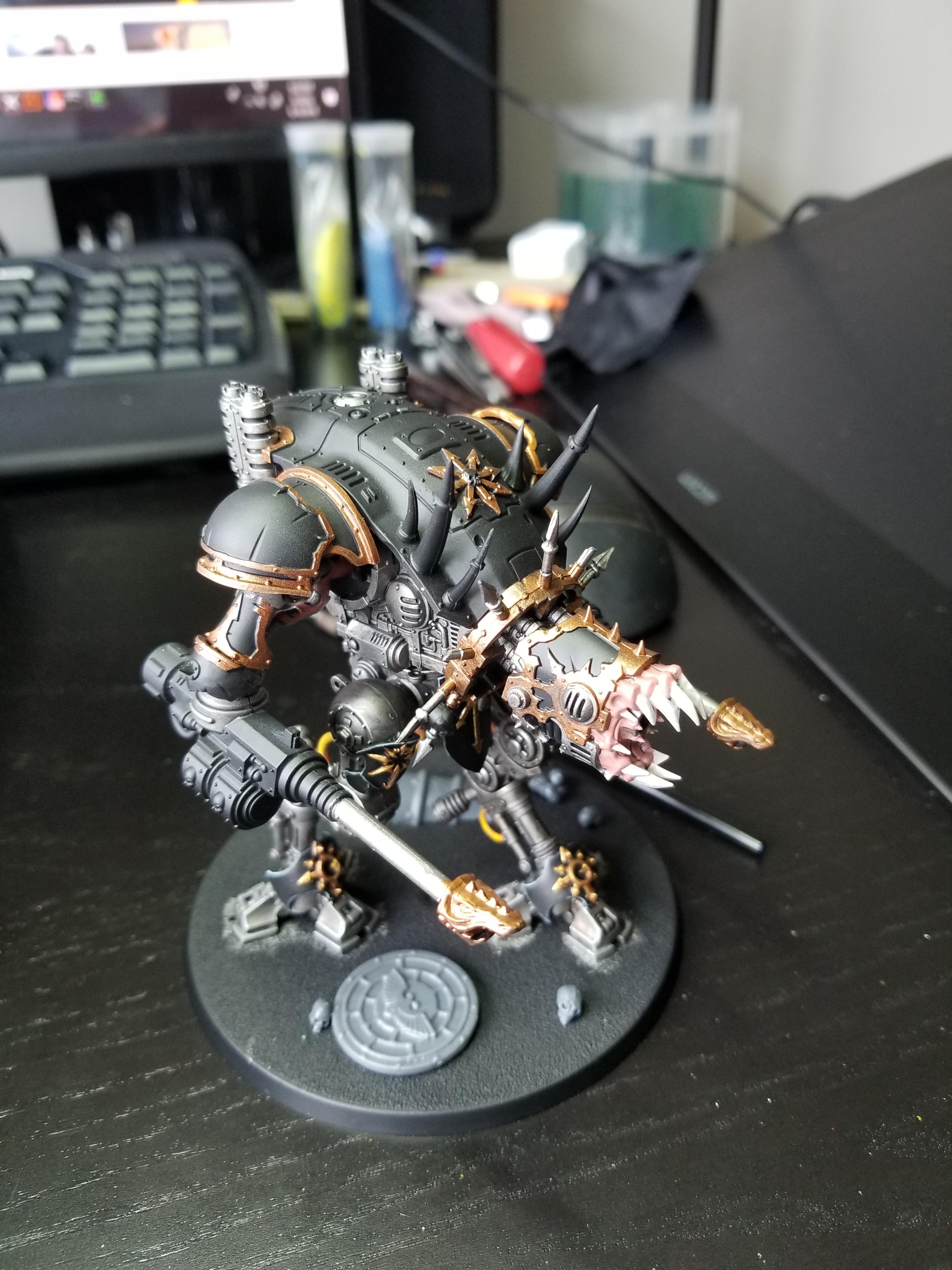 Oh, hey look a renegade knight is painted up in the “Renegade” box. Who’d a thunk? Looking up the knight gave me some basic lore - this is Litany of Destruction, a Freeblade Knight formerly known as Living Litany who betrayed the Imperium. If you check out the Lexicanum article on this knight you can find some more info, which goes into the fall with the typical pulpy flair. The conversion of the basic box model is mild, just cutting the face plate a bit and the majority of the chaos parts was just in the paint job, I wanted mine to be a lot more chaosy so I just kinda fast-forwarded the timeline a bit to give this “Litany of Destruction” time to get decked out in the Eye of Terror, Cicatrix Maledictum, or wherever everyone gets their chaos-bling these days.