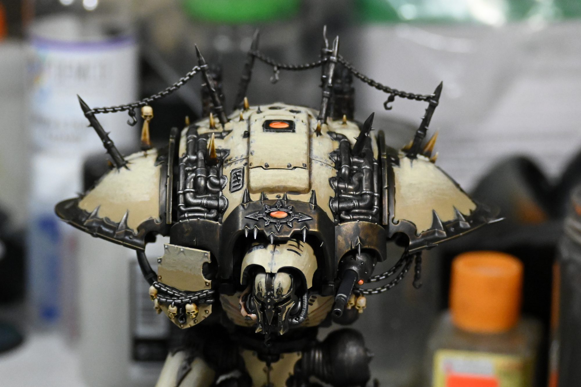 Because this is a daemon engine and no longer something piloted by a mortal, I wanted to make it clear that the pilot's hatch was off limits. The chained aesthetic is something that shows up on other daemon engines and I replicated it here using the small hooks from the Chaos Space Marines vehicle upgrade sprue and some jewler's chains. These always end up being a pain in the ass to paint, but the effect is worth it. I add the chains to the hooks before gluing them down so they end up taught - I don't want them to come off on their own.
