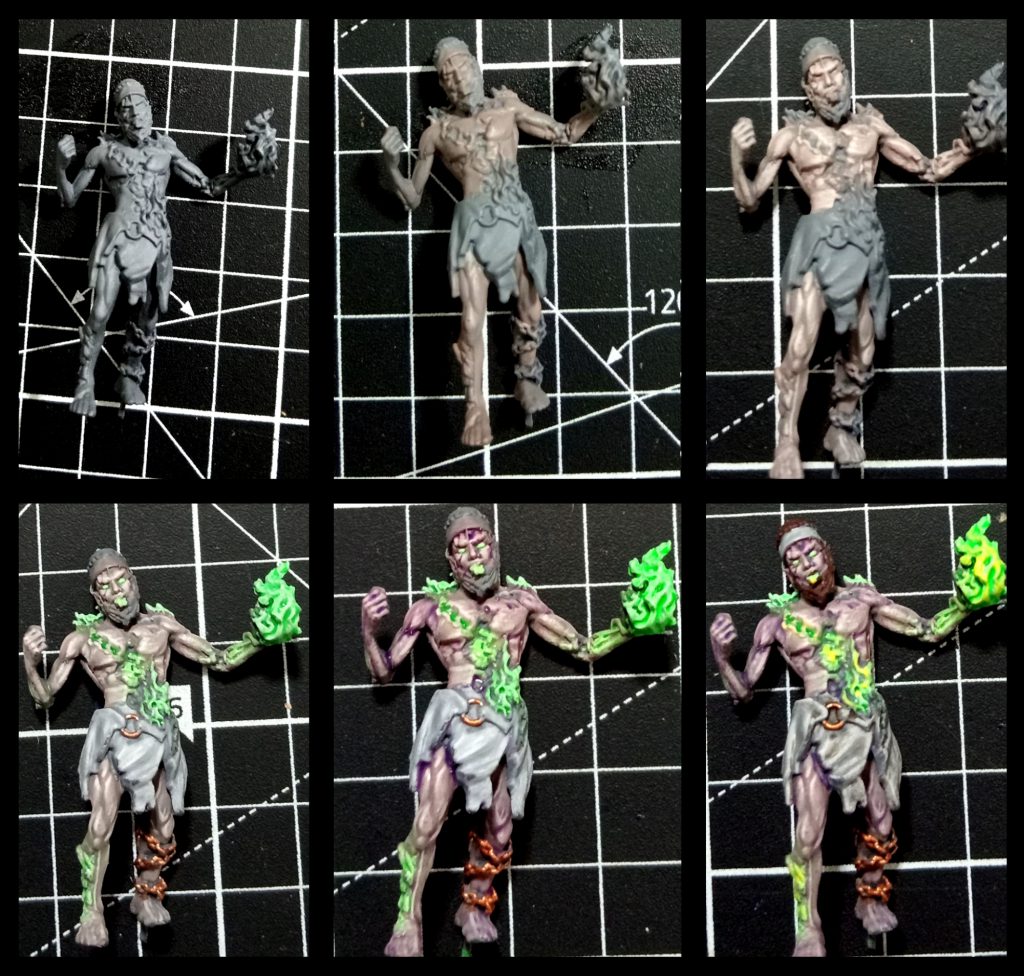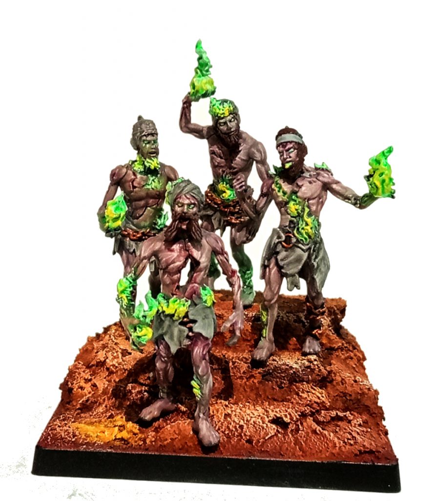 For my Ghols, I wanted to use grey-tone skin colours to really sell them as recently deceased zombies. Additionally, I wanted their clothes/rags to be a neutral colour so that the fluoro green fire stands in stark contrast to otherwise dull,