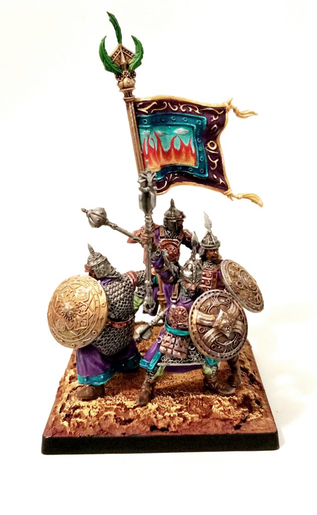 Old Dominion army. So, I decided to reverse the concept and go with a warm basing scheme and cool colours for the models, focusing on a rich blue-green teal and royal purple as the common colour across most units, as well as fluoro green fire (as a red-yellow fire would be a warm colour).