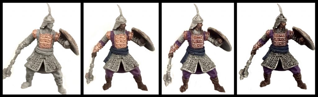 Nuln Oil, Dark Wash, whatever works. Progress your cloth highlights with higher fractions of Blue Violet and Blue Green respectively. Same with the Cork Brown mix for the boots. Finish painting the face as you see fit. For the brass, use a detail brush to apply