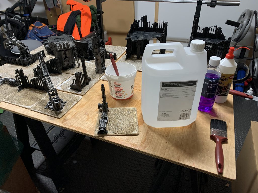 Once the first layer of PVA is dry you can move on to priming if you want, however if this is going to be used for clubs and tournaments it's worth adding some extra strength. I did this using a technique commonly used by railway modellers and other scenic builders, a combination of wet water and diluted PVA. Wet water is a 1:1 mix of methylated spirit and distilled water, adding alcohol to the water allows it to flow in to all the small spaces while also driving a faster evaporative process. For a less toxic option you can mix 1:100 dish soap with water. Start by applying the wet water using a small paintbrush, gently dabbing it on to the basing material and allowing it to soak through. A spray bottle can also be helpful for this, but I ended up just using spare house painting brushes. Once the surface has been wetted apply a watered down PVA solution containing 1:1 PVA to water, a drop of dish soap is also helpful to break the tension further and aid in distribution. This entire process helps the glue mix soak through the ballast layer, increasing the bond strength and overall durability of the texture layer.