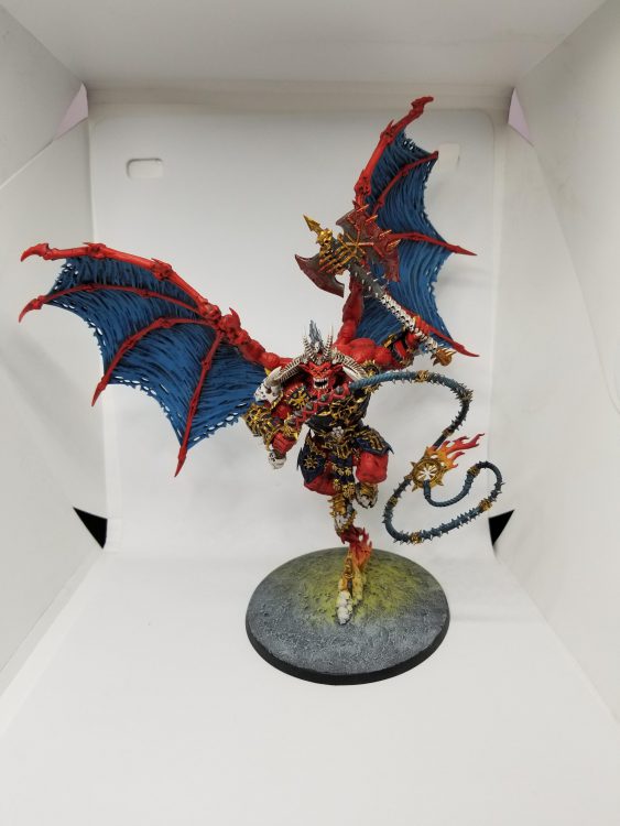The Bloodthirster is a much bigger project and involved a lot more color than most of my Khorne Daemons called for. Specifically, some blues that aren't normally part of the color palette I'm using. For his armor, I highlighted the black armor with a 50/50 mix of Abaddon Black and