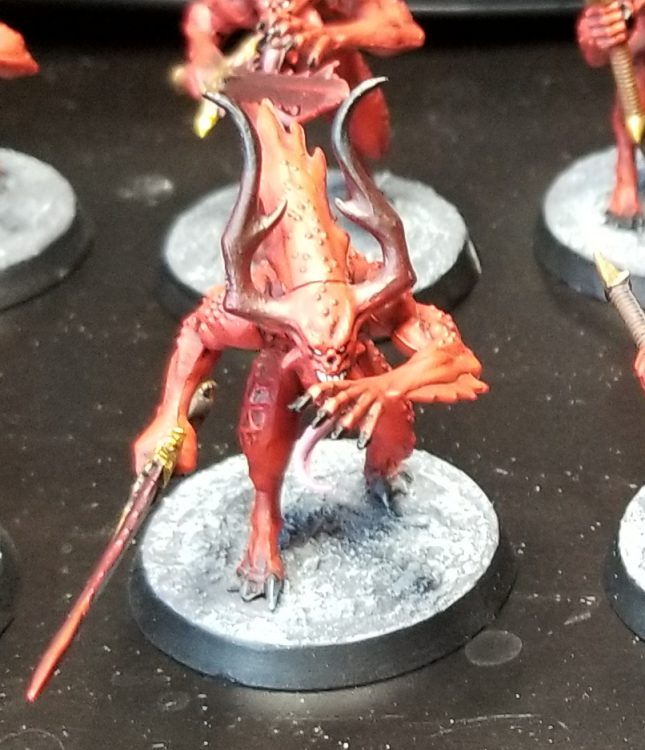 Carroburg Crimson, letting that darken in the areas between the muscles and spots, and then drybrush again with Mephiston Red. The goal is to have the Bloodletters darken toward their feet.