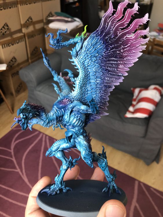 I painted my Lord of Change using mostly my airbrush. It was a while ago so I can't remember the exact colours I used, but that doesn't matter. It's all about creating nice gradients between the blue and purple and highlighting up to white on each one (I use white artists ink through the airbrush for that). Once I'd sprayed on the transitions I heavily thinned down some Citadel washes (purple and blue) with Lahmian medium and coated the model. This helps to get rid of that "airbrushed" look and tie it all together a bit. Then I went in with a brush and highlighted as many feathers and muscles as I could with the Citadel edge paints (these are really great for this sort of thing).